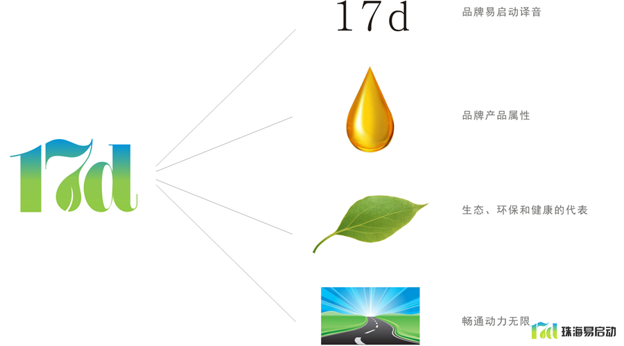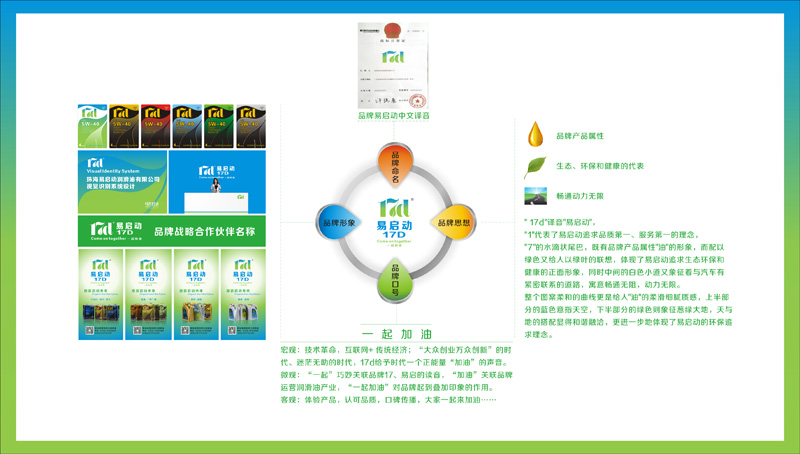“7”的水滴状尾巴,既有品牌产品属性“油”的形象,而配以绿色又给人以绿叶的联想,体现了易启动追求生态环保和健康的正面形象,同时中间的白色小道又象征着与汽车有紧密联系的道路,寓意畅通无阻,动力无限。