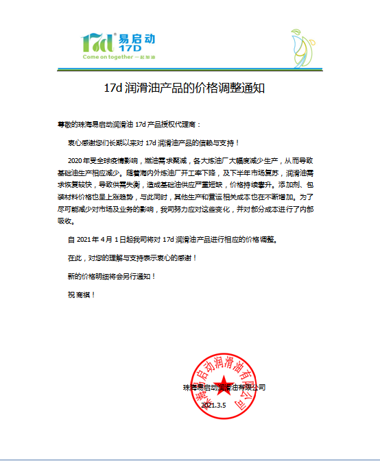 自2021年4月1日起我司将对17D润滑油产品进行相应的价格调整。