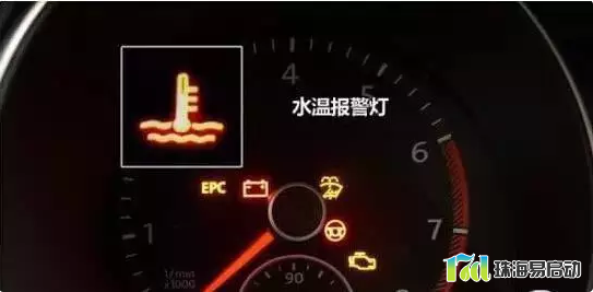 水温指示灯用以显示车辆发动机内冷却液的温度。一些没有水温表的车型(如长城小型车系列)会以指示灯的颜色显示冷却液温度情况:蓝色代表水温过低,熄灭代表水温正常,红色则代表水温过高。发动机最怕的就是缺油、缺水,水温报警灯点亮和机油报警危险系数相当,如果温度过高继续行驶会导致发动机高温,致使缸体变形车主可以自行添加冷却液或纯净水应急。若出现“粘缸”、“呲缸垫”,请立即联系拖车救援。
