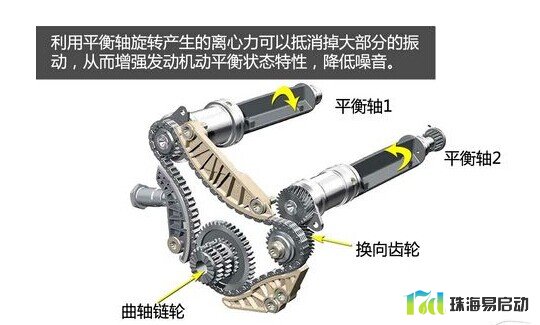 四缸发动机相对于V型发动机来说平顺性不好,因而在发动机内部都会设计有平衡轴用于抵消发动机内部振动。其原理是使用偏心轴旋转产生与发动机振动相反的振动从而实现消振的效果。