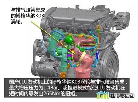 英朗和科鲁兹1.6T上的LLU发动机使用的是博格华纳K03单涡管涡轮,最大增压压力为1.4Bar。而这款发动机具有Superboost超推进功能,当发动机低速运转时,驾驶员深踩油门时,排气旁通阀关闭,增压压力可以在短时间内达到2.4Bar,瞬间输出265Nm的强大扭矩。官方称Superboost超推进功能并不影响发动机的寿命。