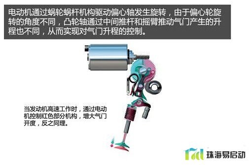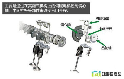 宝马的Valvetronic可变气门升程系统,主要是通过在其配气机构上增加偏心轴、伺服电机和中间推杆等部件来改变气门升程。