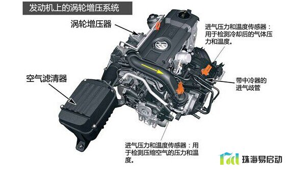 精准监控进气压力的传感器和阀体。在涡轮增压系统的中冷器前后分别安装两套传感器(进气压力传感器和进气温度传感器),用于精准监测增压空气在冷却前后的状态,再通过ECU计算分析来调节涡轮增压器上的阀体开度,从而精确地控制所需要的进气量。