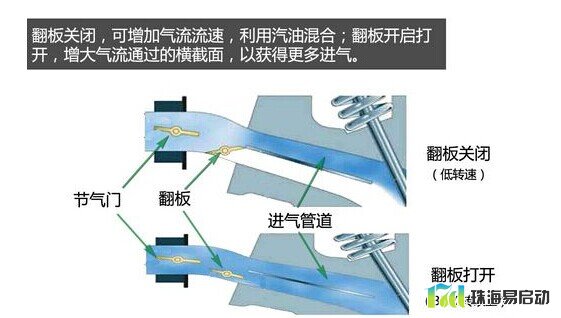 通过控制进气歧管翻板的开闭,可以满足发动机在不同工况下的充气需求。如发动机在低速工况时,通过进气歧管翻板关闭下进气通道,可以减少气流通过的横截面,来增加气流流速,结合活塞顶的特殊设计,有效形成强烈的进气涡流,有利于混合气的形成与雾化。