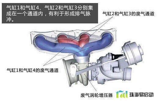 进排气更为充分。按照发动机的点火时间,将点火时间相邻的两个气缸的排气管两两分开(1和4一组、2和3一组),合成两个废气通道,进而推动涡轮。这样可以有效降低各缸的排气干涉,使气缸的排气进气更为充分。