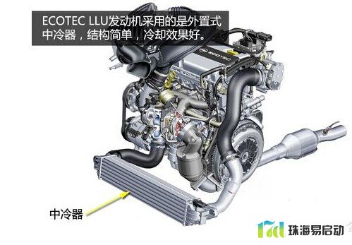 ECOTEC LLU发动机采用外置式中冷器。外置式中冷器体积更大,对增压空气的冷却效果更好。大众的EA888 1.8/2.0L TSI发动机均采用外置式中冷器。