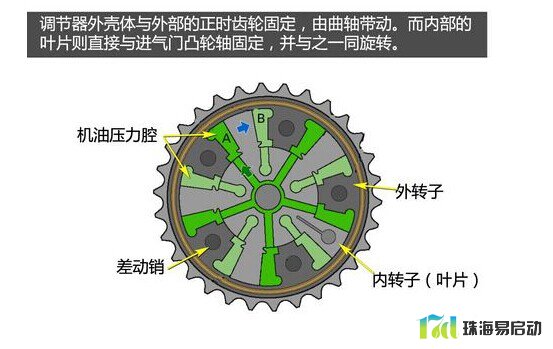 叶片式调节器由外壳体、内部叶片转子以及位于叶片转子内部的锁销组成。外壳体与外部的正时齿轮固定,由曲轴带动。而内部的叶片则直接与进气门凸轮轴固定,并与之一同旋转。