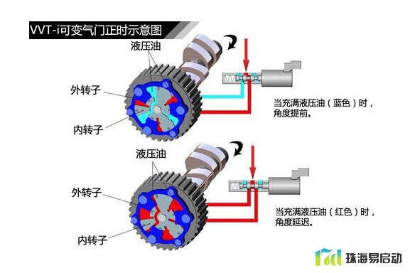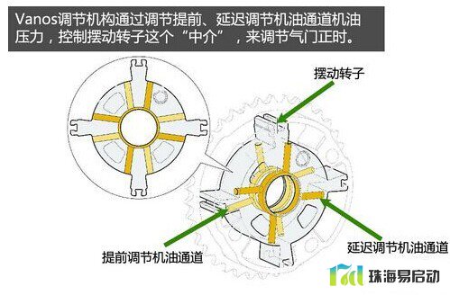工作原理主要是通过凸轮轴调节阀控制相应管道中的液压机油,来驱动调节器中的叶片,进而带动凸轮轴旋转,实现气门开闭的提前或延迟,可调范围达到60°的曲轴转角。