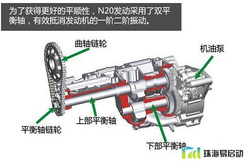 N20发动机采用了双平衡轴,位于发动机底部,由曲轴通过一个齿形链条进行驱动,可对发动机进行一阶和二阶的振动进行消除。