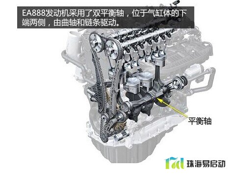 EA888发动机采用了双平衡轴,位于气缸体的下端两侧,由曲轴和链条驱动。利用两根平衡轴自身的旋转产生的离心力正好与曲轴产生的离心力方向相反,可以抵消掉大部分的振动,从而增强发动机动平衡状态特性,降低噪音。