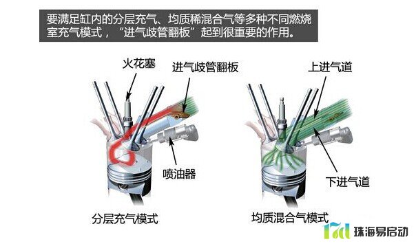 其实要满足缸内的分层充气、均质稀混合气等多种不同燃烧室充气模式,“进气歧管翻板”就起到很重要的作用。如发动机在低速工况采用分层充气模式下,通过进气歧管翻板关闭下进气通道,可以减少气流通过的横截面,来增加气流流速,结合活塞顶的特殊设计,有效形成强烈的进气涡流,有利于“分层”模式下混合气的形成与雾化。同样地,当发动机进入高速工况采用均质混合气模式时,进气歧管翻板开启下进气通道,增大气流通过的横截面,以获得更多进气,提高发动机的输出功率。