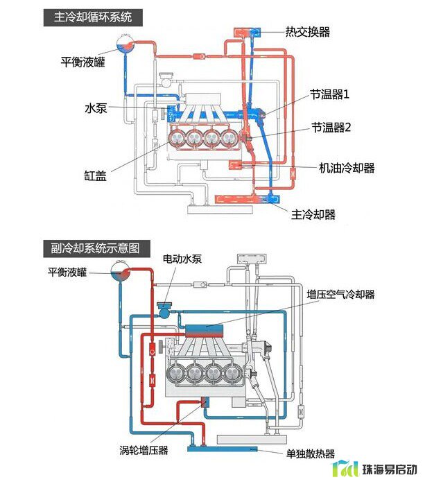 涡轮增压冷却系统,主要由冷却循环泵把冷却液从辅助冷却器中输送至增压空气冷却器和废气涡轮增压器中。主要包括两个循环通道,一个是经过涡轮增压器,对涡轮增压系统进行冷却;另一个是经过进气歧管内的冷却器,对增压空气冷却。