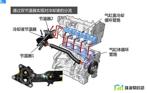 使用双节温器分离两个循环回路,主要有两个优点:一是快速加热气缸体,可以降低曲轴连杆机构内部的摩擦;二是气缸盖得到良好的冷却,降低了燃烧室的温度,增加容积效率且降低发生爆震的可能性。