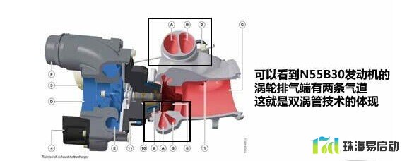 N20发动机采用N55发动机上运用成熟的双涡管单涡轮增压技术。所谓单涡轮双涡管增压器,可以简单理解为将普通的增压器上的涡管分割为两根涡管,涡轮是由两个通道的废气推动的。这样做有什么好处?