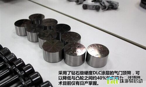 VQ发动机的气门顶筒采用了钻石级硬度的DLC(Diamond Like Carbon)涂层,这种应用将会使凸轮和气门顶筒之间的摩擦减少40%。