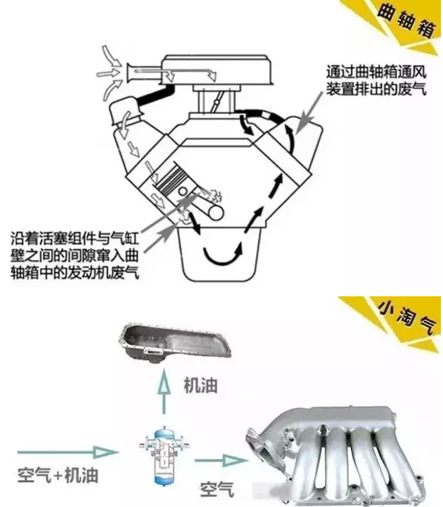首先跟大家说一个系统:曲轴箱通风。为啥曲轴箱需要通风?因为机油需要润滑缸体与活塞,但是一部分机油不稳定,它们会从汽缸壁与活塞之间窜入到曲轴箱中,然后曲轴箱就污了,于是就有了曲轴箱通风,把它们吹走,全都吹走!吹到油气分离器里面。