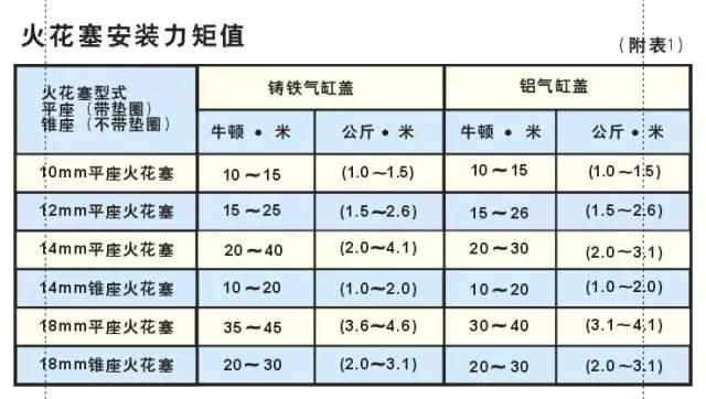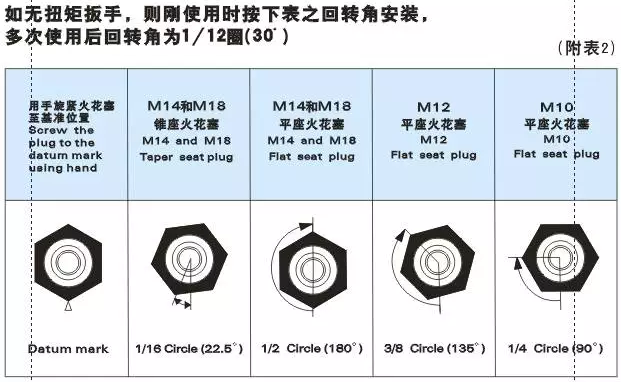 最大安装力矩值适用于螺纹无润滑剂的新火花塞,如螺纹已被润滑,则力矩值应该1/3左右,以避免过应力。如果没有力矩扳手,请按附表2规定的回转角拧紧。