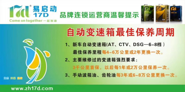 易启动润滑油是新加坡原装进口润滑油品牌,进口油品有汽油机油、变速箱油、柴油机油、刹车油、赛车专用机油、助力转向油、齿轮油、机油添加剂;机油等级品种分全合成机油、高级合成机油、合成机油、高级机油、基础机油。17D润滑油提供各种机动车用油保养技巧、油品知识、润滑油供应资讯、预约换油自助选油程序;协助合作门店提供专业车辆维修、保养美容、机车零部件更换等4S店级服务;易启动商城可查机油价格、机油级别、机油标号并可在线购买各车载用品油品.易启动现诚邀润滑油加盟代理商合作协助提供换油等汽车服务。